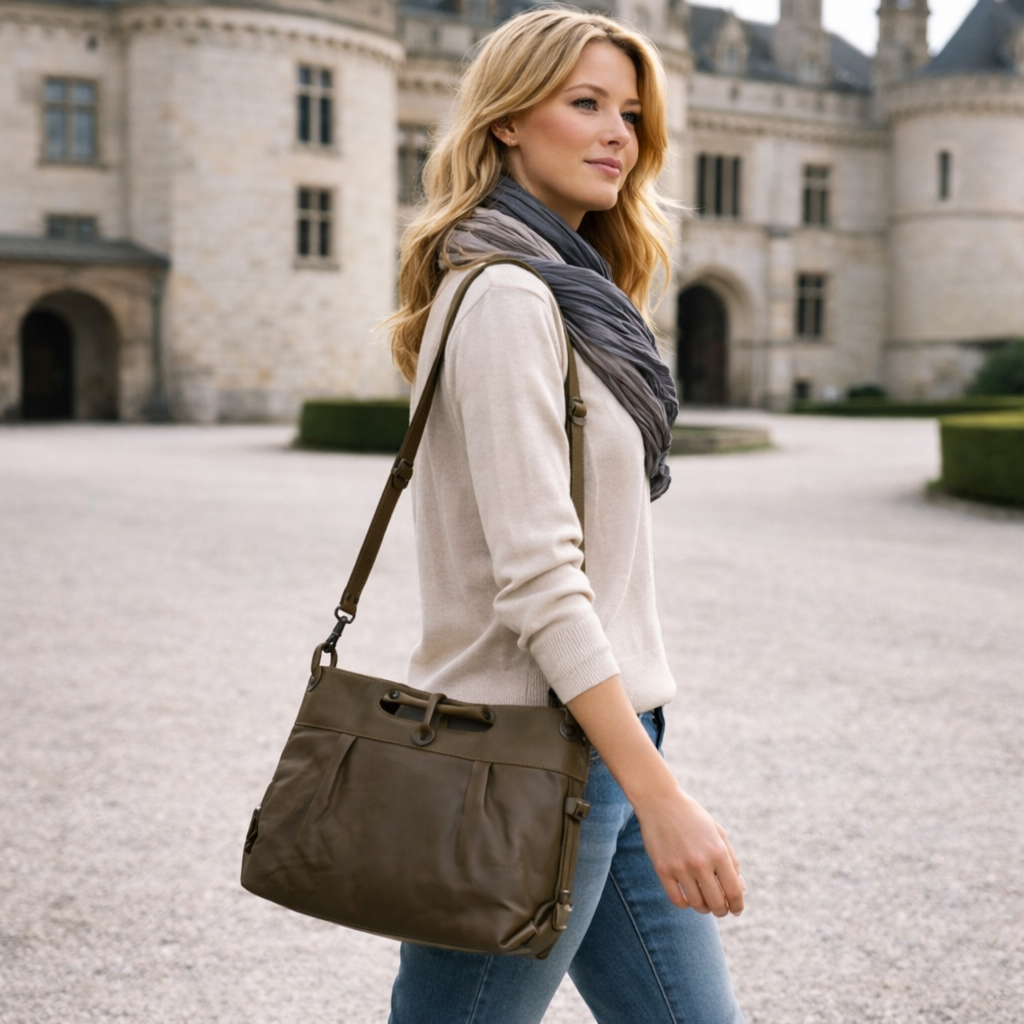 - 1 langer, verstellbarer Schulterriemen aus Leder mit praktischem Karabinerhaken (max. Länge: 120cm)