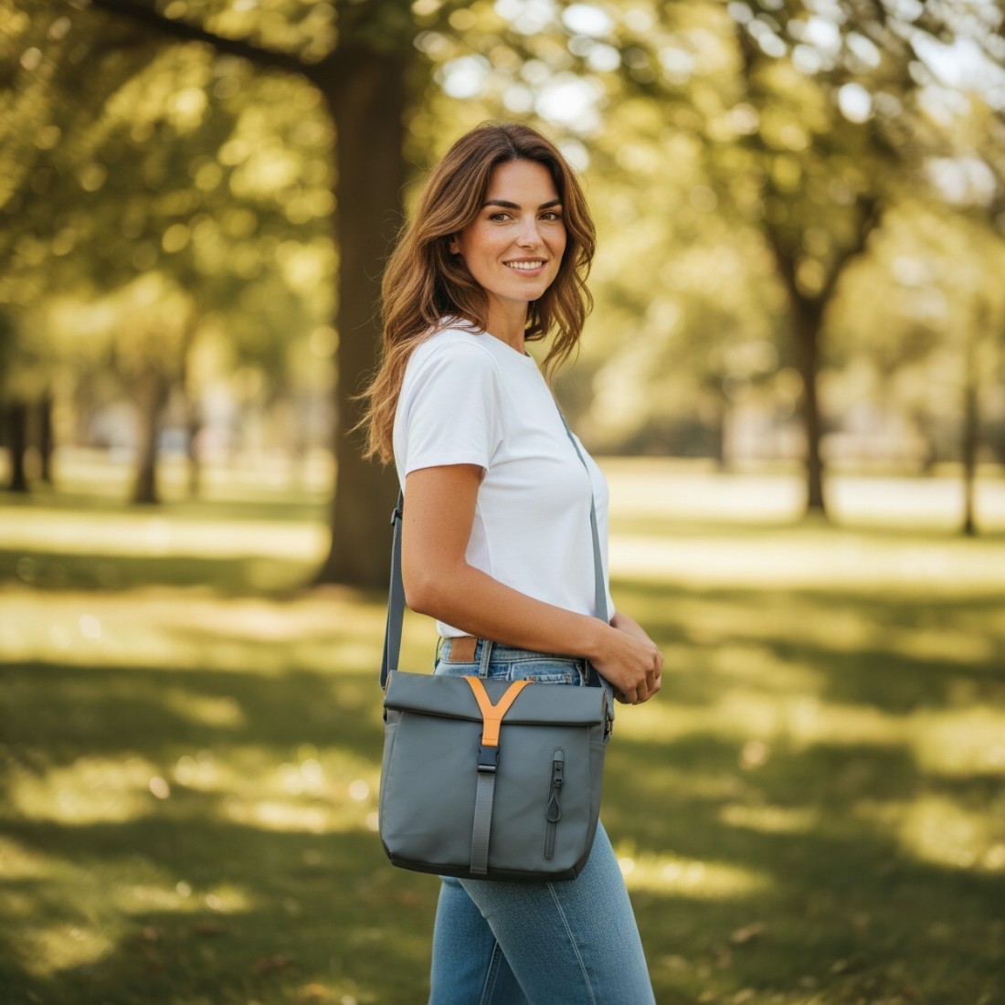 - Smartes Tragen Dank langem Schultergurt + variablen Volumen durch Rolltop