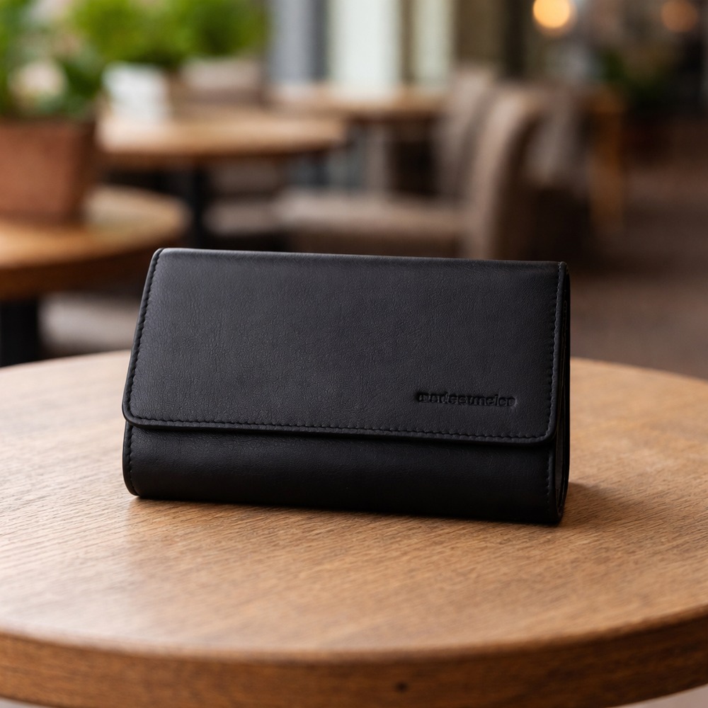 - Eigenschaften: Überschlag mit Druckknopf * Münzfach mit Zip * 2 Scheinfächer * Kreditkartenfächer * große Steckfächer * Ausweis- / Fotofach