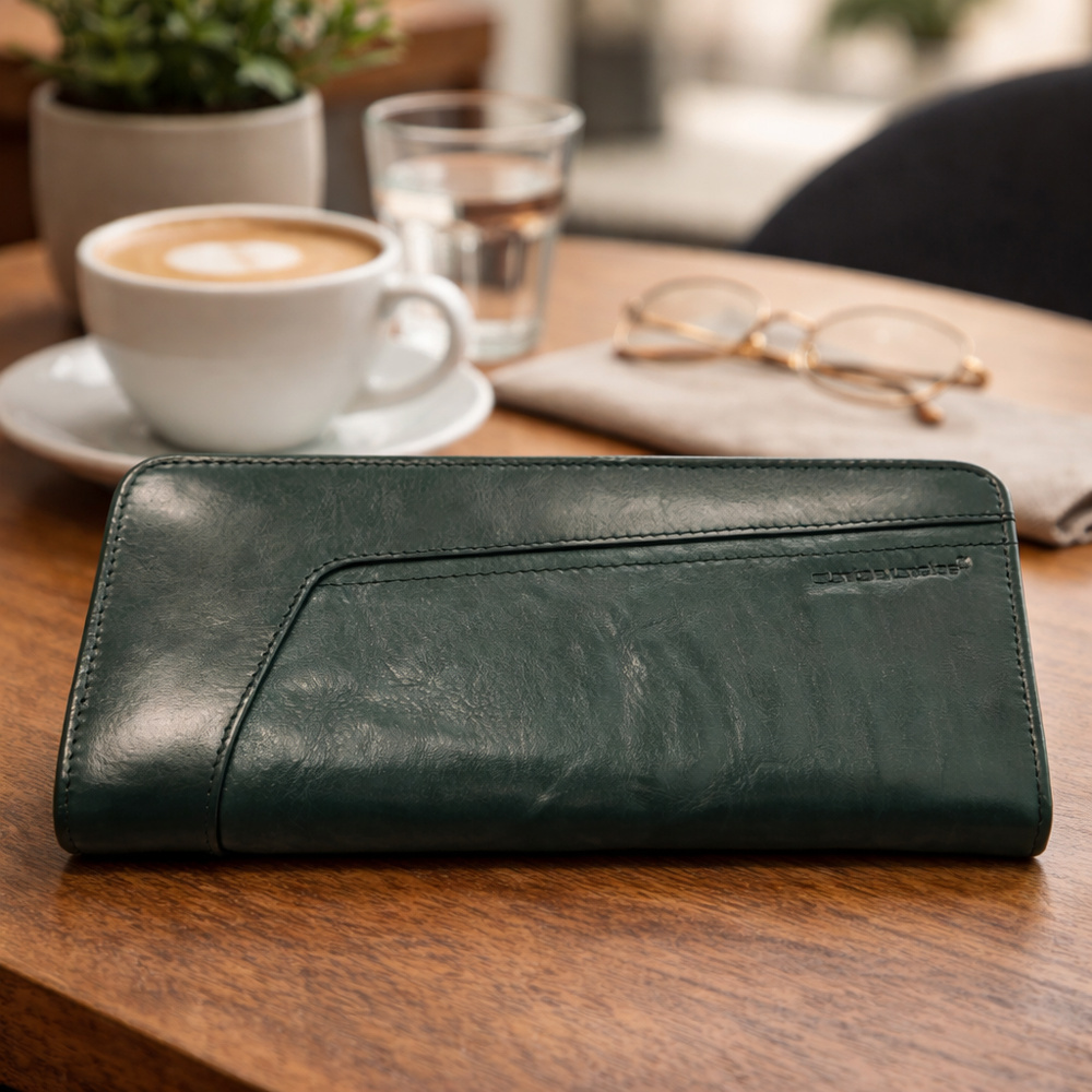 - Damenbörse L mit sinniger Zweiteilung trennt Bargeld von Karten.
