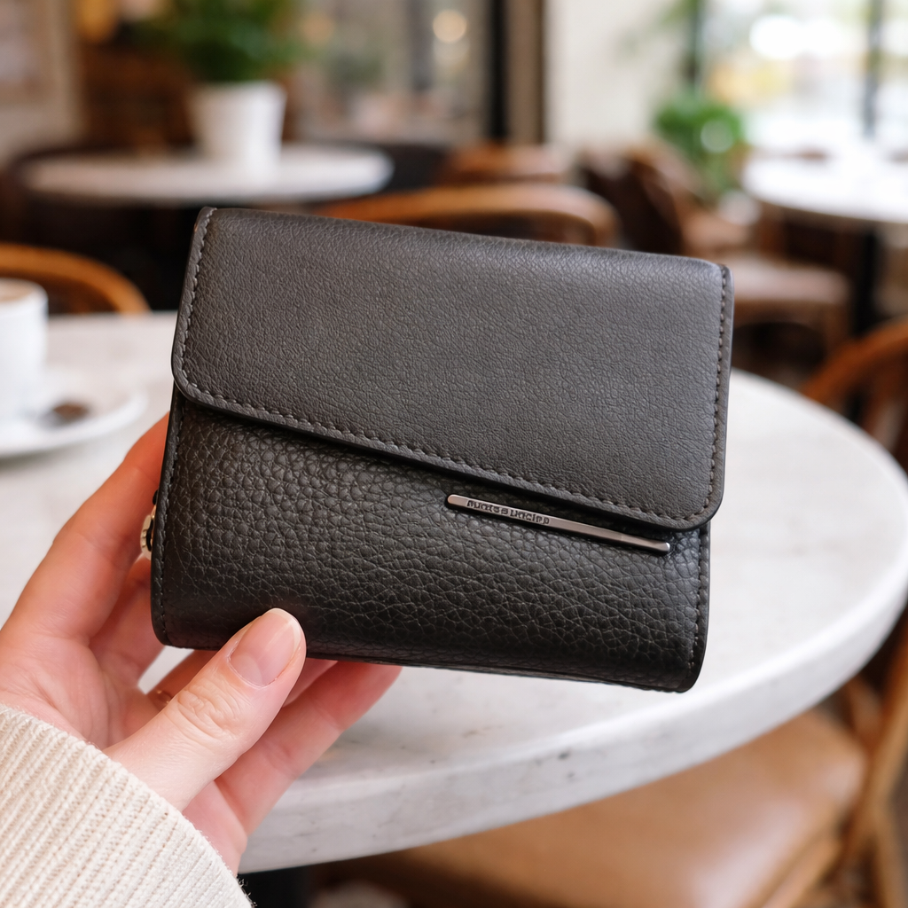 - Eigenschaften: Hauptfach mit Klappe + Druckknopf * Münzfach mit RV * Kartenfächer * Scheinfach * RFID-Schutz *steckfach