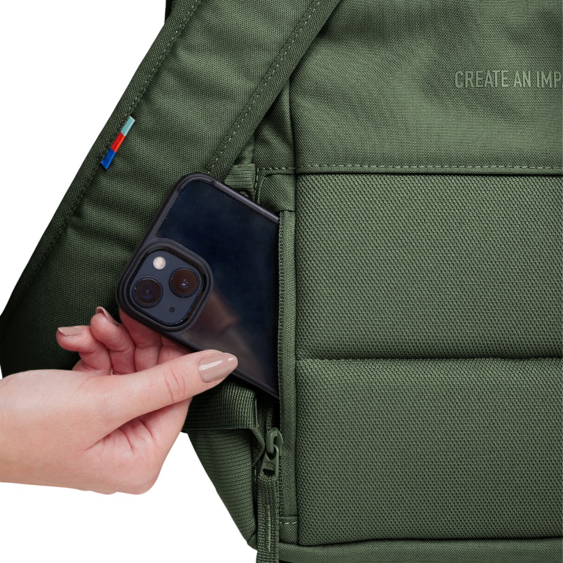 - Materialzusammensetzung: 59 % Ocean Impact Plastic Gewebe, 17 % andere Recycling-Materialien, 24 % nicht recycelte Materialien (Reißverschlüsse, Polsterschaum, Schnallen)