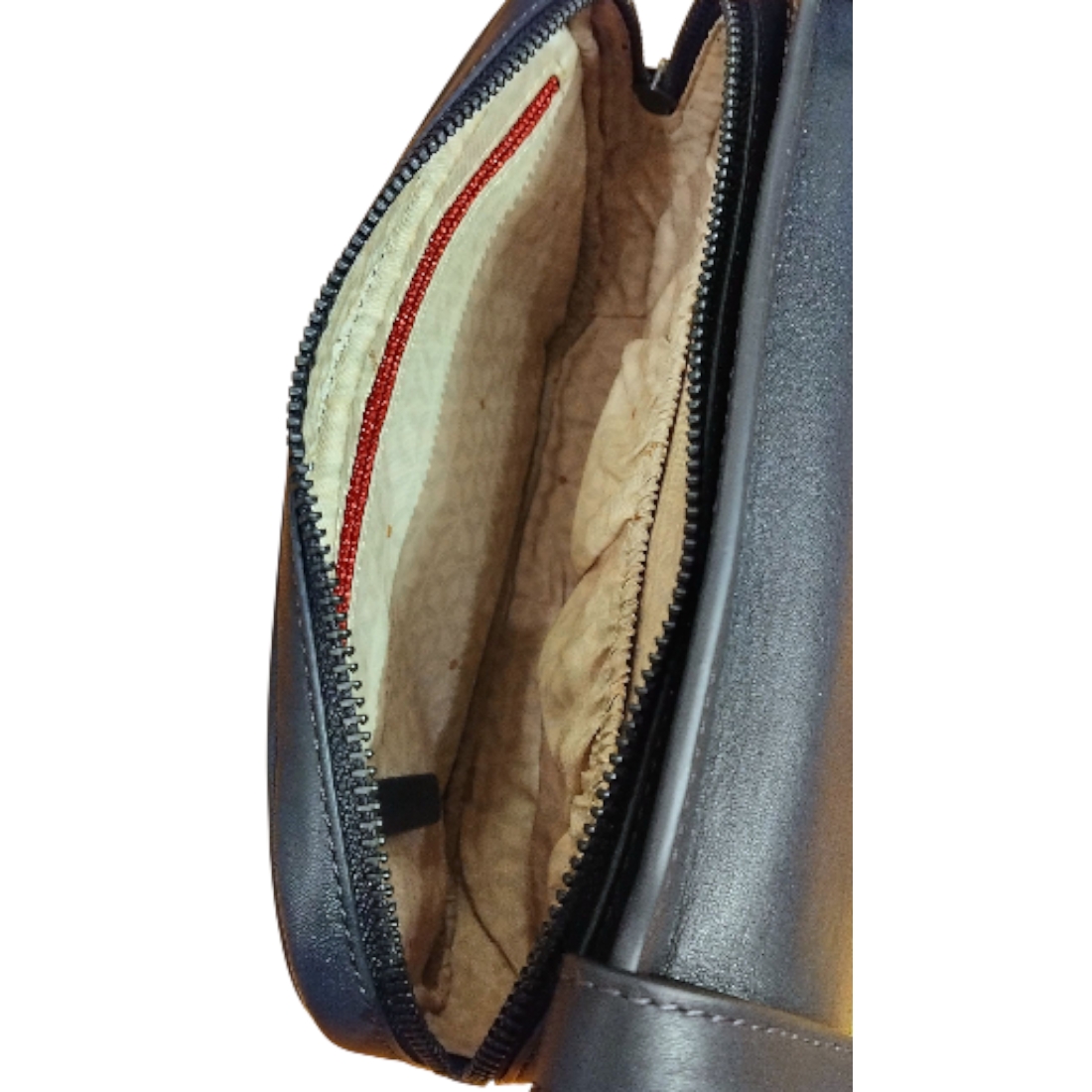 - Hinten: 1 Fach mit Zip + Druckknopfsicherung